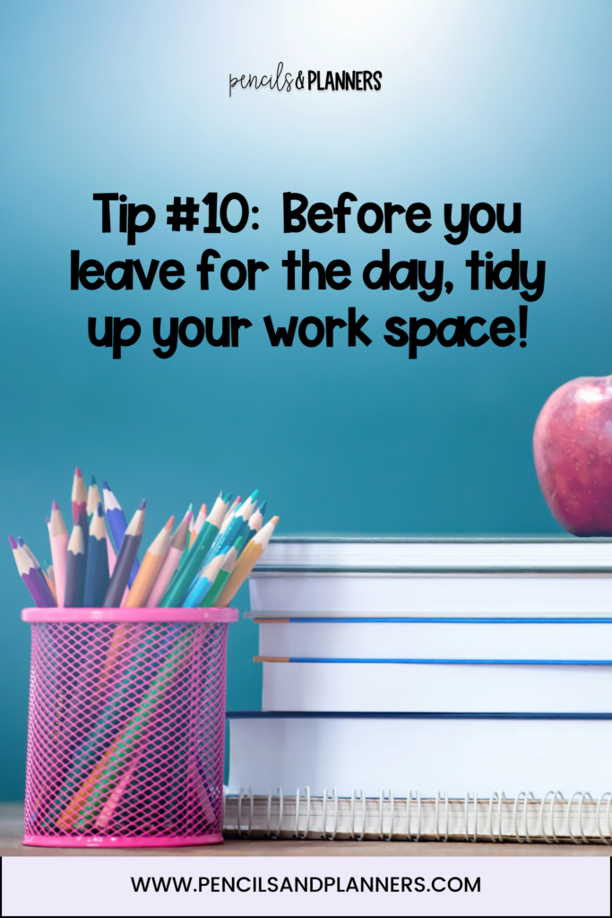 At the end of any given day, you might have tons of homework and classwork to grade, recent unit data to analyze, post-its, and absence letters – all strewn across your desk. Before you leave, set aside a couple of minutes to minimize what stays on your desk. If it’s staying on your desk it should be in your plan to address the following day. Whatever WILL be on your desk should be neatly organized. Personally, I organize my materials based on what I need to do first – top priority is at the top of the pile for tomorrow’s tasks.